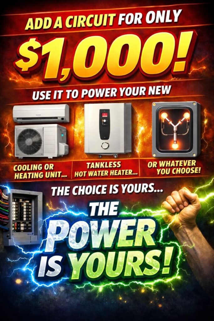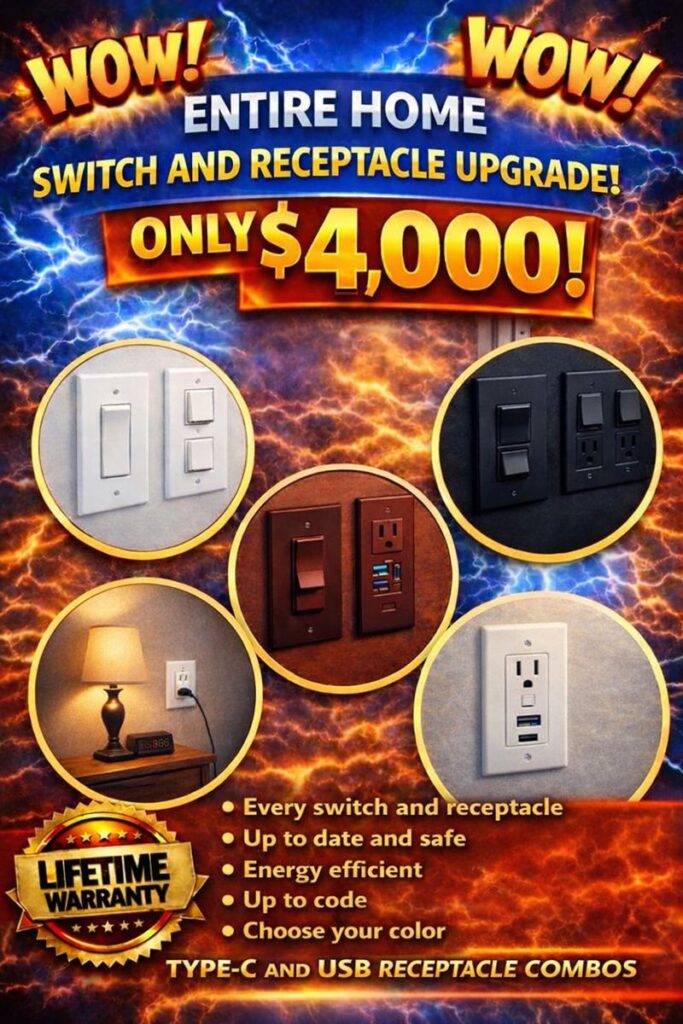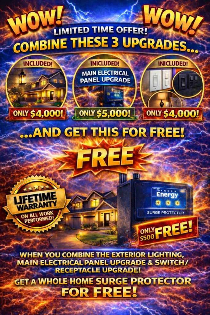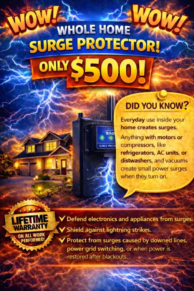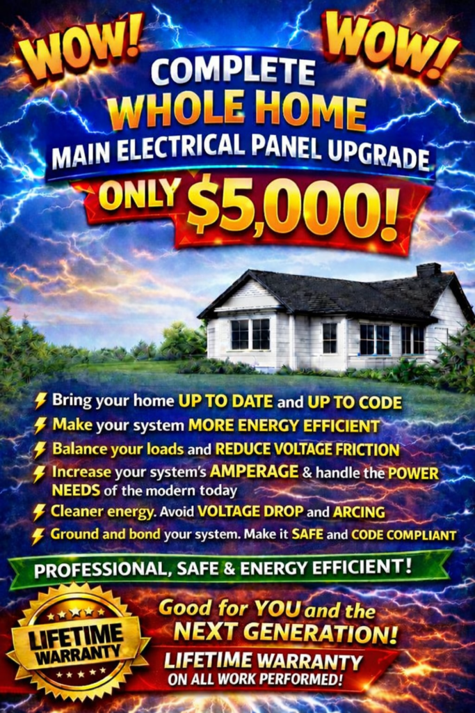 RESEDENTAL, SURGE, PROTECTORS, LIGHTING, EV CHARGERS, MAIN PANEL UPGRADES, SOLAR, TROUBLE SHOOTING AND REPAIR, ELECTRIC COOLING AND HEATING OPTIONS, WHOLE HOME BATERYBACK UP SYSTEMS, SMART DEVICES, TANKLESS HOTWATER HEATERS, MINI SPLITS, SWITCH AND RECEPECTICAL UPGRADES AND CUSTOM ELECTRICAL DESIGNS FOR CUSTOMER NEEDS. CHECK OUT OUR TURN A SPACE INTO A ROOM AND WHOLE HOME ELECTRICAL SMART PANELS.